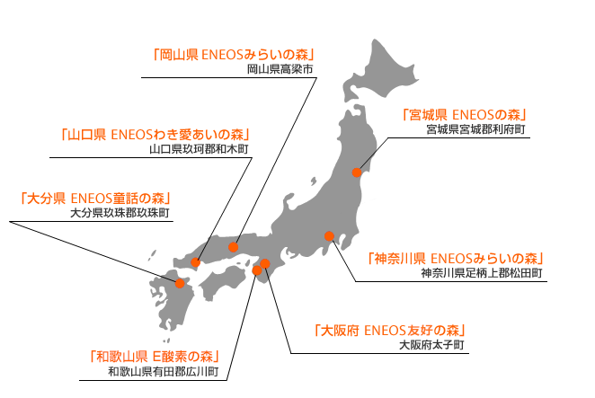 地方自治体または(公社)国土緑化推進機構とパートナーシップを結び、一定エリアの未整備な森林の保全を支援する活動のフィールドとして、「ENEOSの森」とネーミングした支援エリアが、宮城県、神奈川県、大阪府、岡山県、和歌山県、山口県、大分県の7か所にあります。