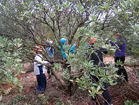 2011年12月 3日に、開所式を行い、引き続いて森林保全活動を実施しました。ヤマモモ林の下草刈り、枯れ枝・下枝の伐採作業などを行っています。