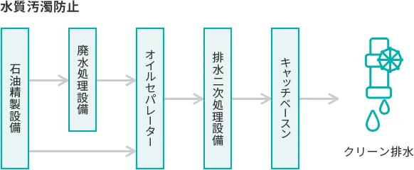 排水処理は、2つの廃水処理設備とオイルセパレーター(API式、CPI式)、二次処理設備およびキャッチベースンから構成されており、何重もの関門を通って、きれいな水に戻して排水しています。