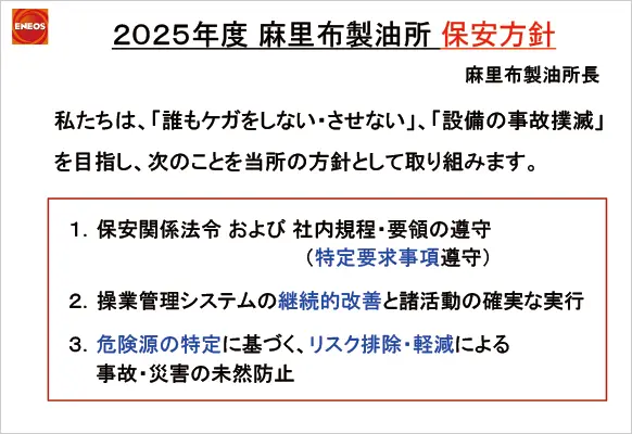 製油所操業における基盤とも言える保安力について、自所の強み、弱みや業界内での位置づけが明らかになるため、当所では定期的に保安力評価を受け、明らかになった各種課題の解決に向けて対応し、継続的に改善に取り組んでいます。