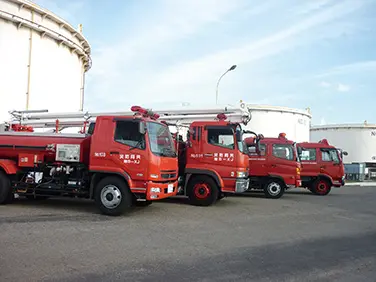 異なる性状、形態を持つこれらの設備群の災害は千差万別で、機動性のある消防車と各設備に設置している防消火設備を効率よく運用する事を防消火活動の基本としています。また、所内には消火栓、消火器の他、固定式・移動式泡消火設備、固定式散水設備等を設置しています。