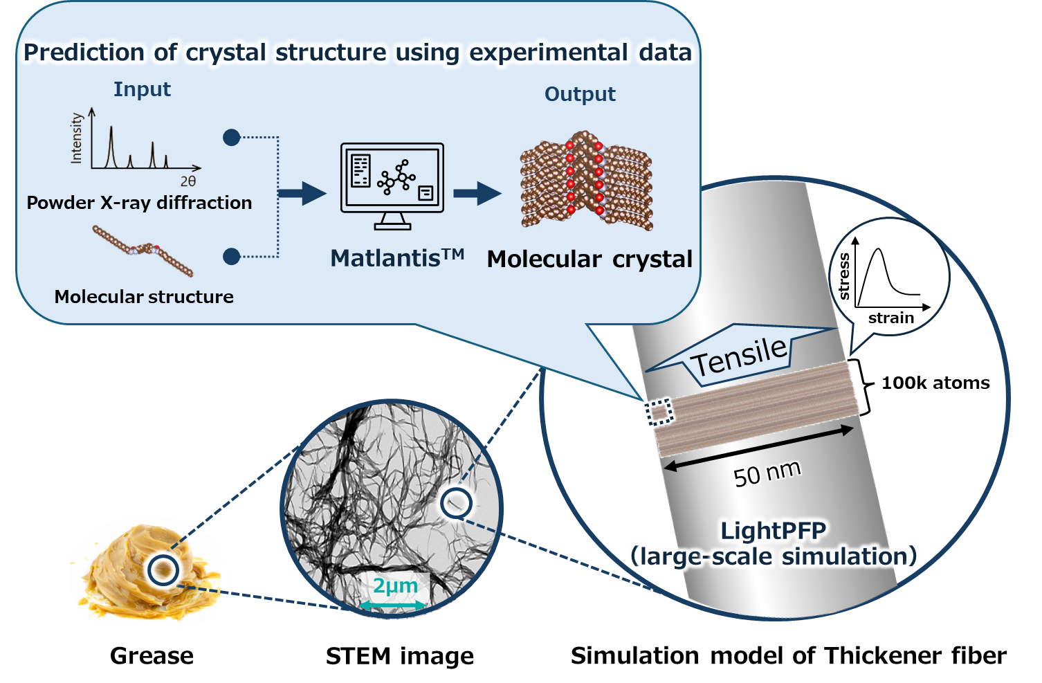 Using advanced simulation technologies such as MatlantisTM, we design lubricants and greases. After estimating actual structures using analytical data, we perform large-scale simulations with LightPFP, enabling more realistic reproduction of phenomena. An example of the results applied to grease is shown in the figure. We were able to clarify for the first time the factors that cause differences in grease performance based on molecular structure and establish design guidelines. We are also promoting the creation of next-generation lubricants by utilizing this simulation technology for a wide range of applications, including lubricants for automobiles, home appliances, and industrial processes. (Click here for the Lubricant R&D page)