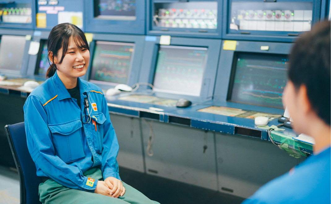 仕事を教えて。印象に残っているのは、油種切り替え時に行うメーターマン作業です。私はDCS(プラントの運転制御システム)でバルブを遠隔操作し、ドラム(槽)のレベルや圧力を調整する役割を任されました。最初は考えることが多く頭が真っ白になりましたが、先輩方の指導を受け、また経験を重ねるうちに変動を予測して先回りできるようになりました。装置のレベルを安定させながら、運転の切り替えをやり切れたときの達成感は、今も鮮明に覚えています。