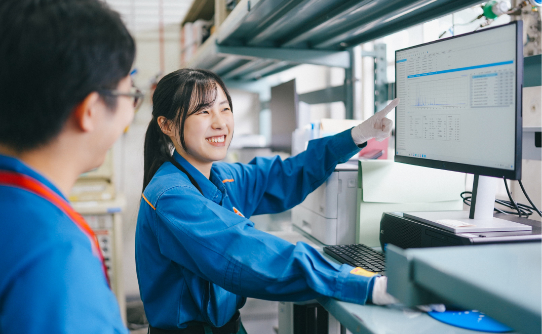 仕事を教えて。新たな分析装置の導入作業です。準備段階から試験器の構造や使用前点検に使用する適正試料の選定、許容差の計算方法など、これまで以上に深く試験法を学び直しました。また、メーカーの方と一緒に設置や点検を行う中で、普段は知ることのできないノウハウを学ぶことができ、対象試験への理解を大きく深めることができました。単なる分析装置の導入にとどまらず、自分自身の成長につながる経験として強く印象に残っています。