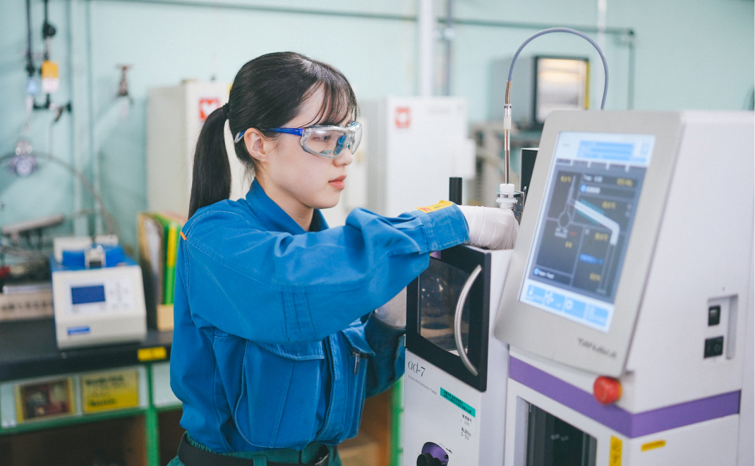 品質管理グループは、所内装置の精製油から出荷まで、製品の品質を安定的に保ち、お客様に安心・安全な商品を届けることを役割としています。私たちは、各工程の検査において試験法に則った分析試験を担当し、性状に問題がないか、規格を満たしているかを確認しています。日々の業務を通じて製品の品質を支える責任を実感し、細やかな分析の積み重ねが社会全体の安心に直結していることを意識しながら取り組んでいます。
