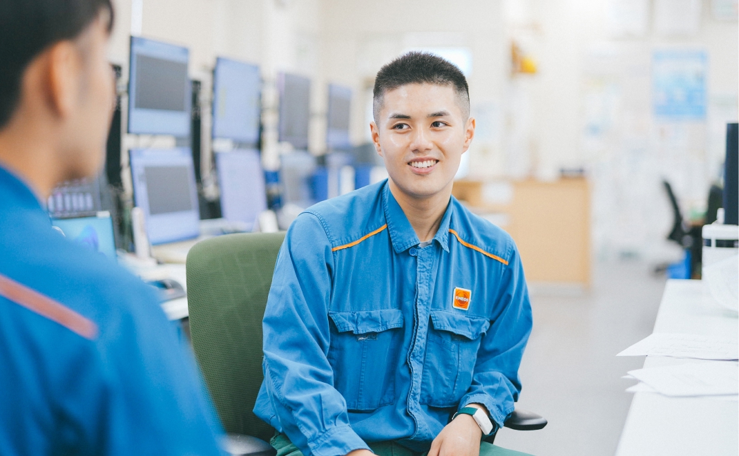 仕事を教えて。一番印象に残っているのは、入社1年目に経験した定修(定期修理)工事です。装置を停止して清掃や整備、補修を行う大規模なメンテナンスで、先輩方から丁寧に指導を受けながら取り組みました。入社1年目の自分の力はまだ小さかったですが、設備の構造理解や関係者との連携を学ぶ貴重な経験になりました。