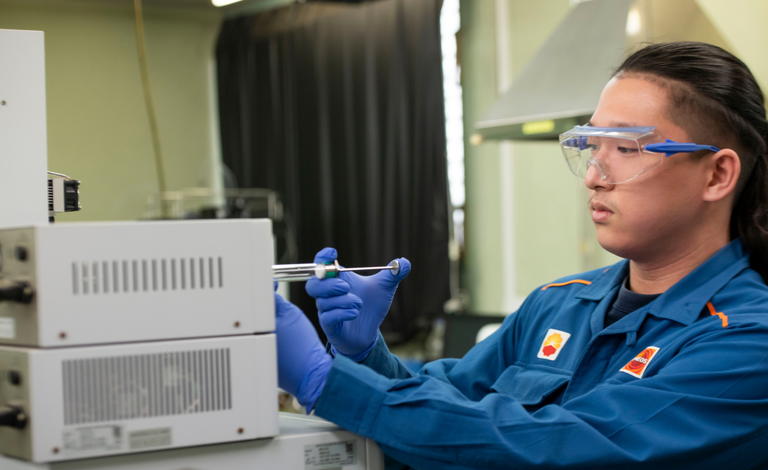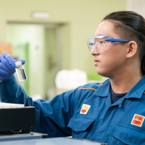 仕事を教えて。印象に残っているのは、従業員の家族を招いた製油所見学ツアーです。私は蒸留試験の実験担当として参加しましたが、子どもや家族にもわかりやすく説明する必要があり、実験プラン作りに苦労しました。結果的に、蒸留の仕組みを理解してもらうことができ、人に伝える力を身につけられた貴重な経験となりました。