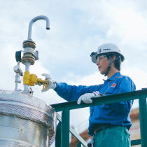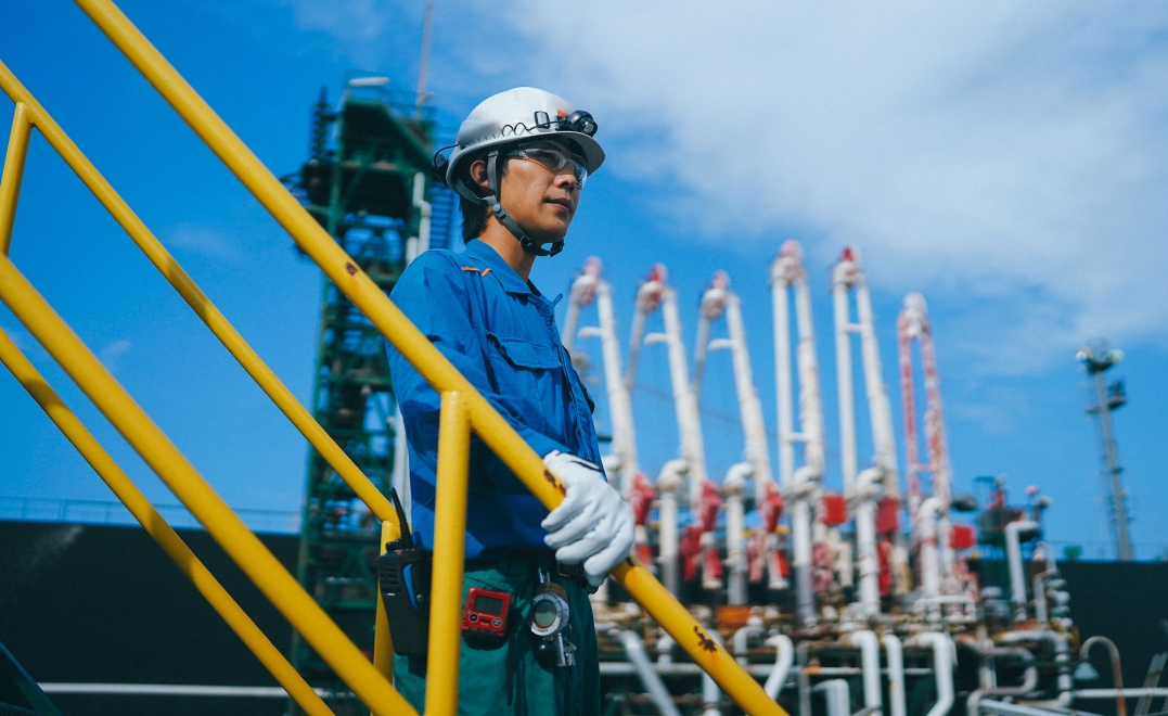 所属する操油グループでは、原油や製品油の貯蔵管理を担当しています。具体的には、港での揚荷や出荷作業、タンクへの積み込み、在庫管理などを通じて、安定した原料供給と製品出荷を実現しています。私自身はタンク点検や、揚荷・出荷作業時のバルブ操作を担当。日々の点検や効率化の工夫を通じて、安全で安定した操業を支える役割を担っています。