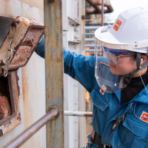 仕事を教えて。印象に残っているのは、2年に一度の「定修(定期修理)」です。装置を計画的に停止し、入念なパージ作業を経て開放・修理を行います。普段は見られない塔の内部や触媒の様子を間近で見ることができ、普段は立ち入れない高さの場所から現場を見渡す経験もしました。静まり返った夜勤務の現場も含め、日常業務では得られない体験ができた初めての定修は、特に印象に残っています。