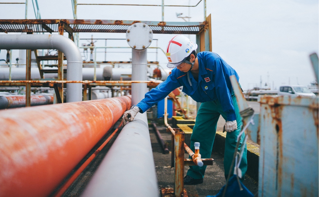 製油所は長期間にわたり稼働を続けているため、装置や配管の一部が劣化していることがあり、劣化部分から石油やガスなどの漏洩を防止することが重要です。所属する設備検査グループでは、配管や装置を検査し必要な対応をとり、漏洩を防ぐことで製油所の安定操業を支えています。具体的な業務は、検査箇所や範囲、方法を選定し、協力会社に依頼することが中心です。劣化による漏洩が発生したら自身のグループの責任となりますが、その分、使命感と大きなやりがいを感じられる仕事です。