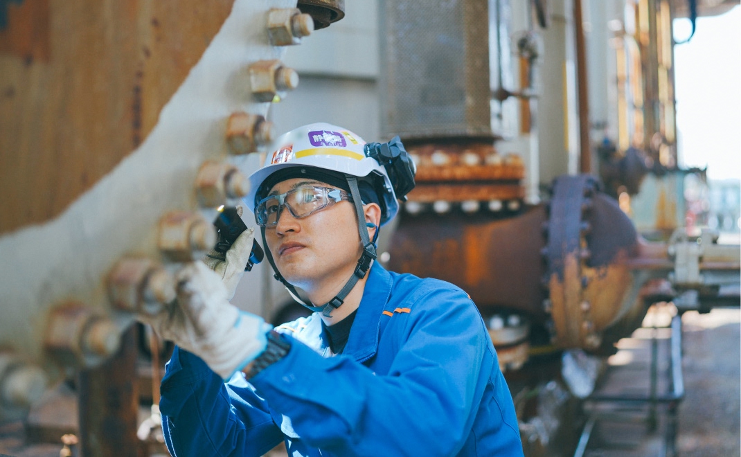 自分が一から計画した工事が無事に完了した時は、安心と共に達成感、やりがいを感じます。特に大型工事は計画も工事も大変ですが、その分やりがいも大きなものがあります。また、それぞれの装置で特性が異なるため、補修方法が異なることも多く、製油所での仕事には膨大な知識が必要です。まずは、どの装置にも対応できる力・知識を付けていくことを目標としています。ENEOSでは様々な事業を展開しているため、いずれは製油所で得た知識や仕事のノウハウを活かして、新しい仕事にもチャレンジしたいと思っています。