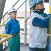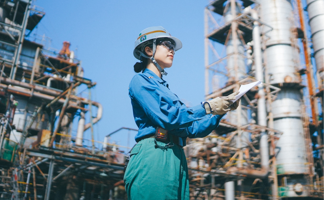 製油所内の静機器と呼ばれる設備のメンテナンスを担当しています。現場で運転グループが発見した不具合に対して、補修方法や流体条件に適した材質、工期などを検討し、協力会社へ発注します。契約時には、適正な金額で実施できるよう査定も行います。工事中は安全に作業が行われているか、指示通りに進んでいるかなどを確認し、状況に応じて柔軟に対応します。突発的なトラブルには迅速に対応しつつ、長期的な補修方針を検討してより良い保全につなげることも重要です。